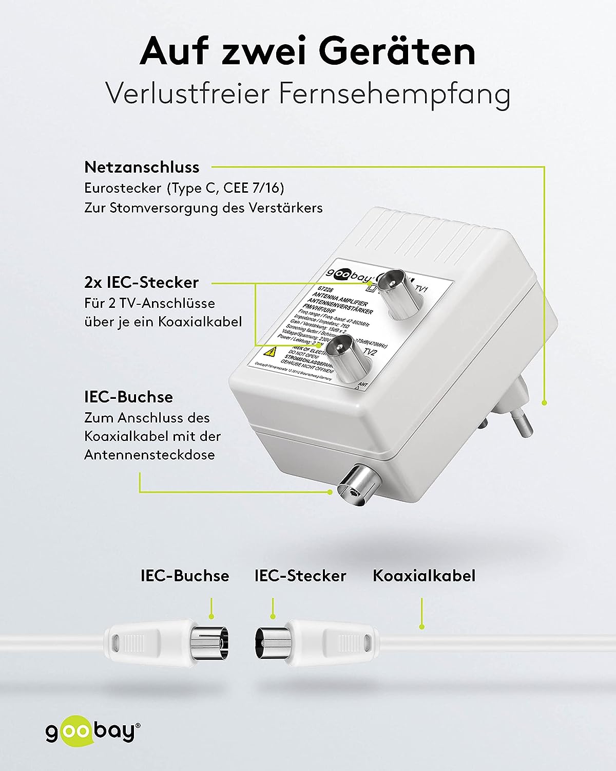 Goobay 67226 Zweigeräte Breitband Antennenverstärker für Kabelfernsehen (DVB-T / DVB-T2 / DVB-C) zum Anschluss von zwei Empfangsgeräten (TV / Radio), 2x 15 dB Verstärker; 2,7 Watt