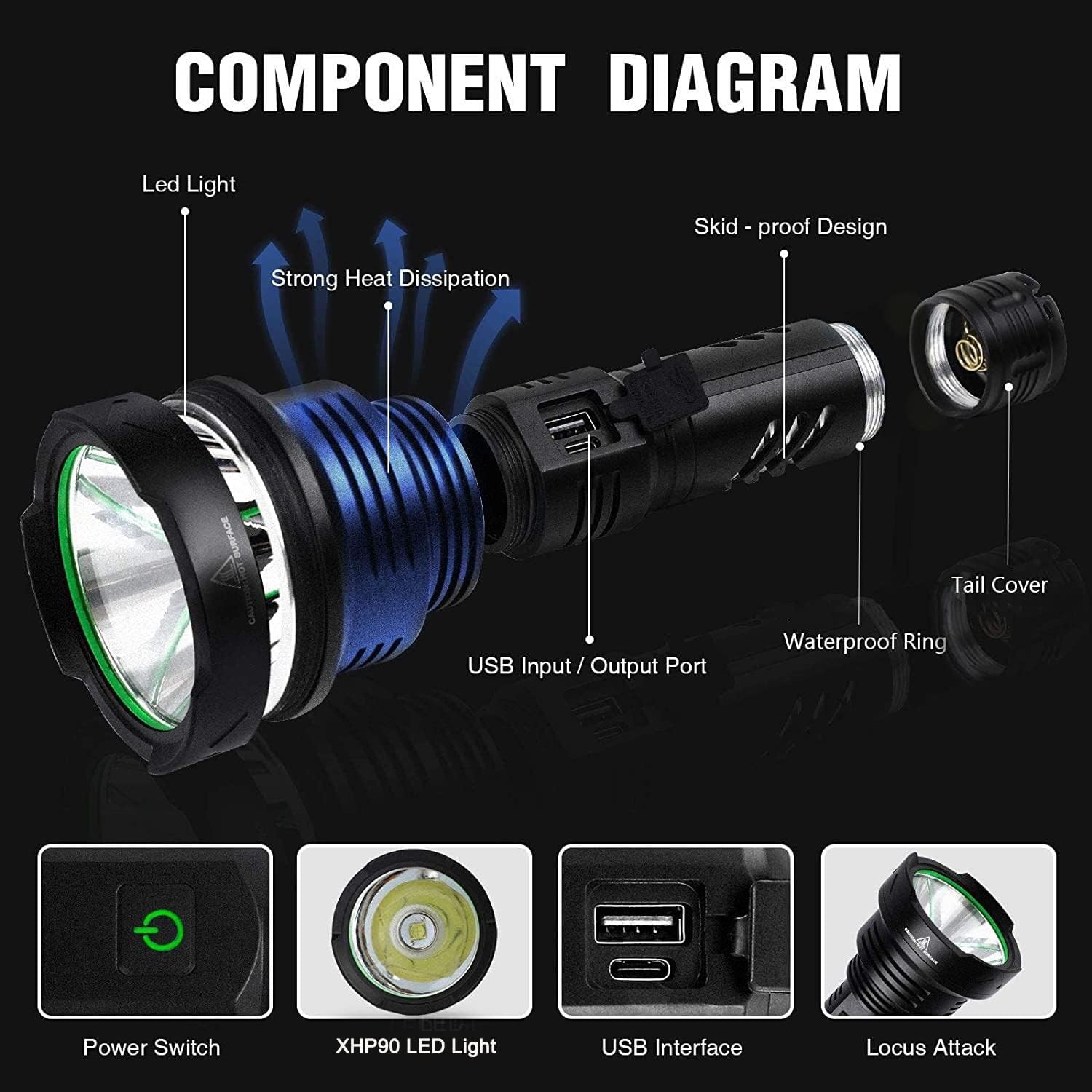 SENDALE LED Taschenlampe Extrem Hell 100000 Lumen CREE Taschenlampen, XHP90 Taschenlampe Batteriebetrieben,IP67 Wasserdicht,5 Lichtmodi Aufladbar USB-C für Camping,Ausrüstung,Militär,Outdoor